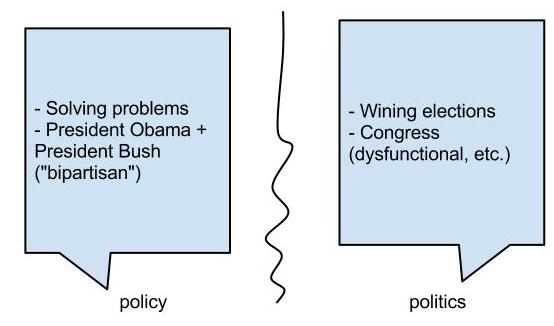 In this blog-post, I am interested in a similar kind of boundary work w.r.t. "politics" that happens in American public culture (which builds on the pre-existing boundary work w.r.t. science). The boundary work in public life then consists of establishing that something--a course of action, a guiding principle--is "policy" and not just "politics." "Policy," here, is seen as the opposite of politics: a rational technocratic exercise where a group of skilled people sit down and solve problems. Policy-making obviously gains its legitimacy from its similarity to doing science and from science's cultural authority, in particular, its image as rational, skeptical, and as being about facts rather than values. Since it is governments that do policy, and governments are almost always seen as political, how might one separate policy from politics--and that too, using the cultural authority of science? I would say that it is done by seeing policy-making as "solving problems" rather than, say, resolving conflicts between opposing interest-groups.