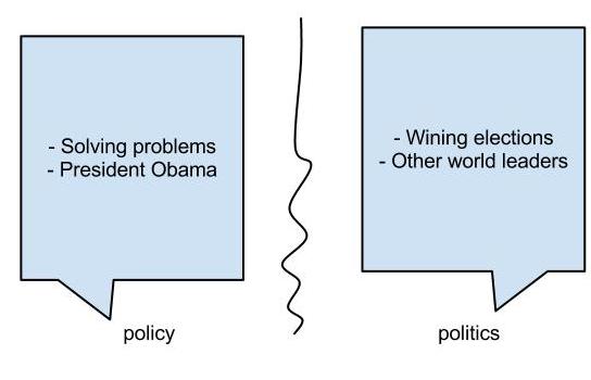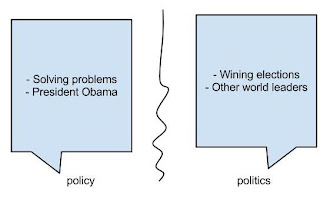 I always had the sense that he was going to put policy ahead of politics. And he always made it clear to people working for him that our job was to inform him of what the relative merits were of the policy choices, not to try to do the politics for him, or to limit our prescriptions by what was politically expedient. I think the country was very lucky because as you know, there have been lots of other examples in other countries, and certainly in our history, where the leaders of the country were much more reluctant to put politics aside and take the sting of a more decisive resolution. I’ve talked about this before, but I think that what really distinguishes countries in crisis are those that are lucky enough to have political leaders who are willing to take the brutal political cost of doing what’s necessary and those countries that waited and let the populist fires burn, or decided they were going to try to teach people a lesson and put populism ahead of other things. Those countries had far worse experiences in crisis than we had. [my emphasis].Politics here is identified with the messy, grubby business of getting votes. And political costs are just that: electoral defeats. Good "policy" can lead to electoral defeats, and President Obama, Geithner says, did not put politics first (meaning electoral victory), unlike a lot of other world leaders. Or, to put it in a rather crude pictorial version: